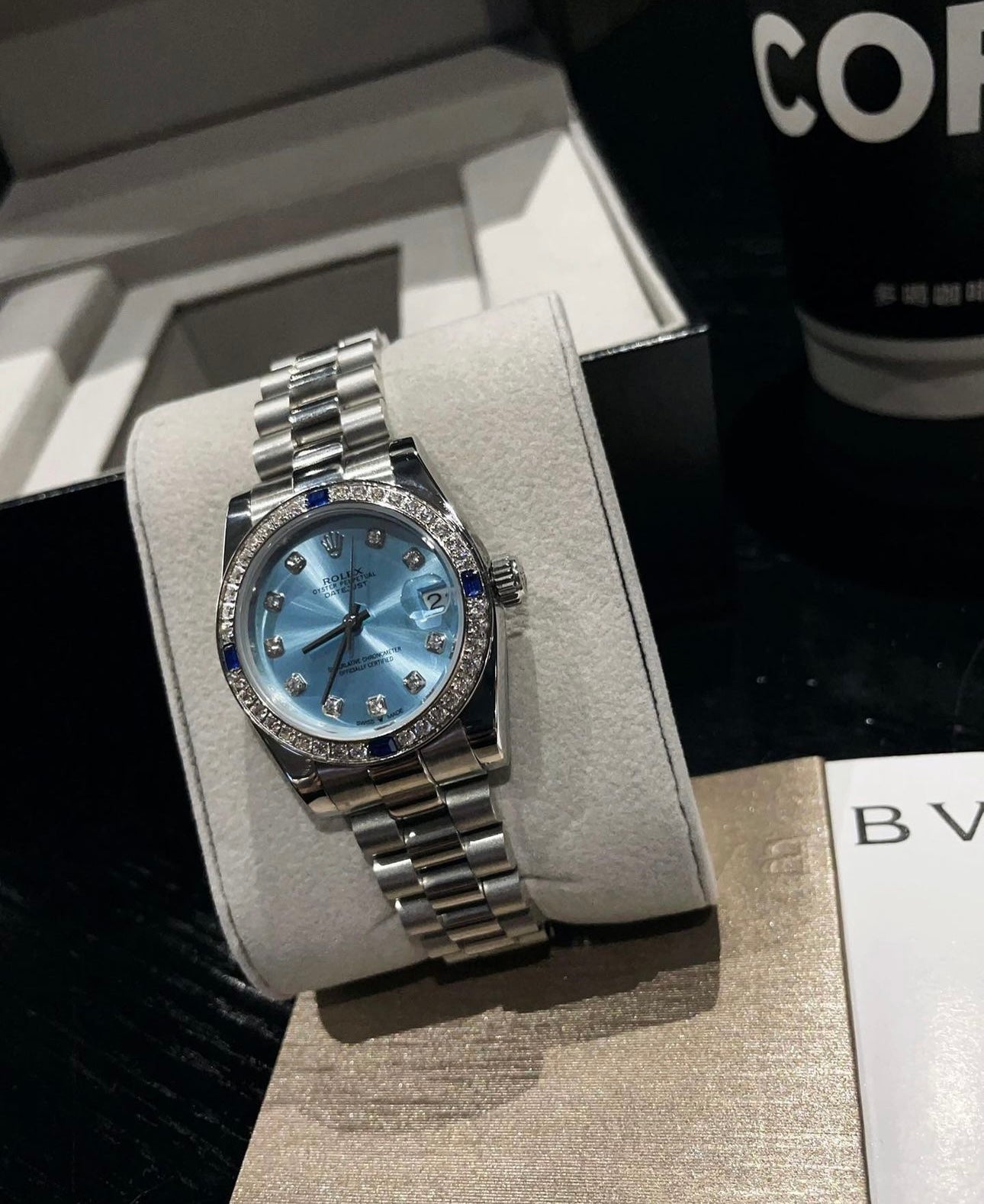 Dial & Design: Features elegant Roman numerals, diamond-set markers, and the signature Cyclops lens over the date window, enhancing readability and style.